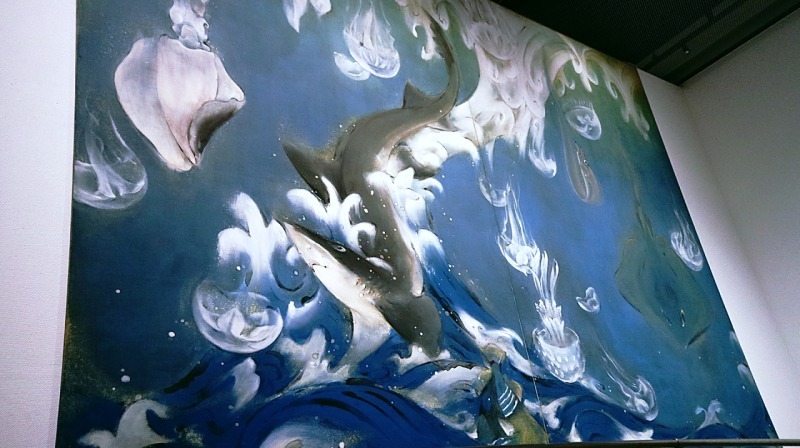 縦3.5メートルを超える巨大な作品。狂ったようにサメが身をくねらせ、クラゲやイカ、エイなどさまざまな海の生物が画面から勢いよく落ちてきます。竜巻で宙に巻き上げられた魚たちが波しぶきとともに降ってくる瞬間を捉えています。