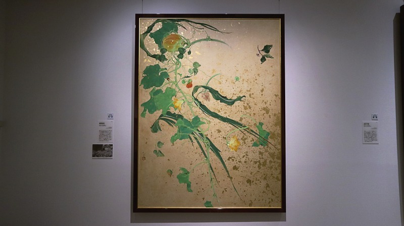 戦争を背景にした龍子作品をもう一点。一見、典型的な美しい日本画のように見えますが、これは終戦直前に自宅が爆撃を受けた一瞬を描いた作品。爆弾によって吹き飛ばされた菜園の野菜が宙を舞い、画面に散りばめられた金箔は爆発の閃光や爆風の記憶なのです。