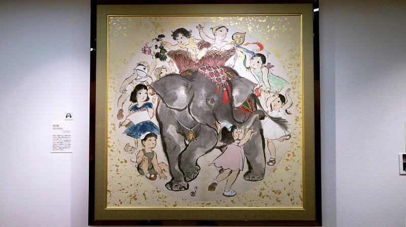 芝浦に到着したインディラは、歓迎する人びとに囲まれながら上野動物園まで歩いて行進。その時のようすを描いた作品です。龍子の温かみのある視線が感じられます。