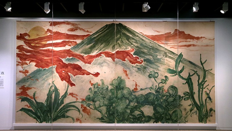 中央にドンと構える富士と、朱に染まった雲が印象的なこの絵は、龍子が亡くなる前年に描いた作品です。とても80歳とは思えない大胆でダイナミックな構図。龍子は最後まで大画面を貫きました。