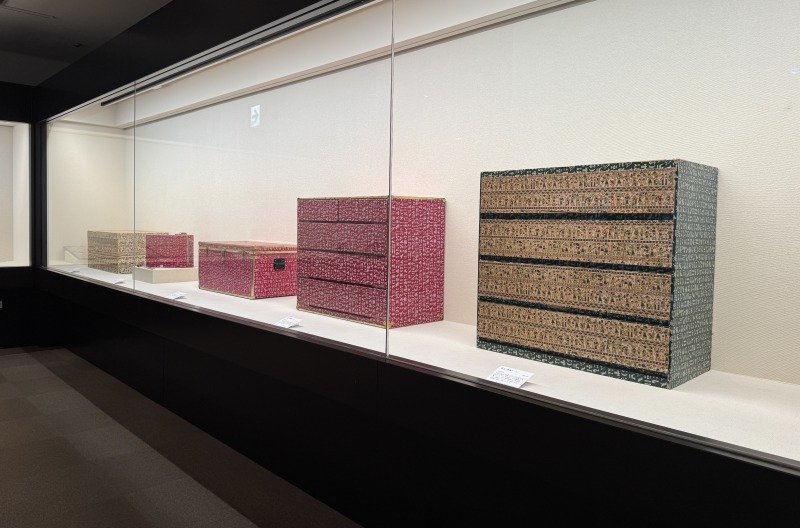 木製の整理タンスにも、赤や緑の化粧紙が使われています。