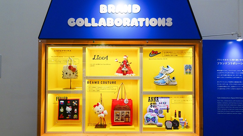 さらに、キティがさまざまなブランドやキャラクターとコラボした商品展示のコーナーもあります。