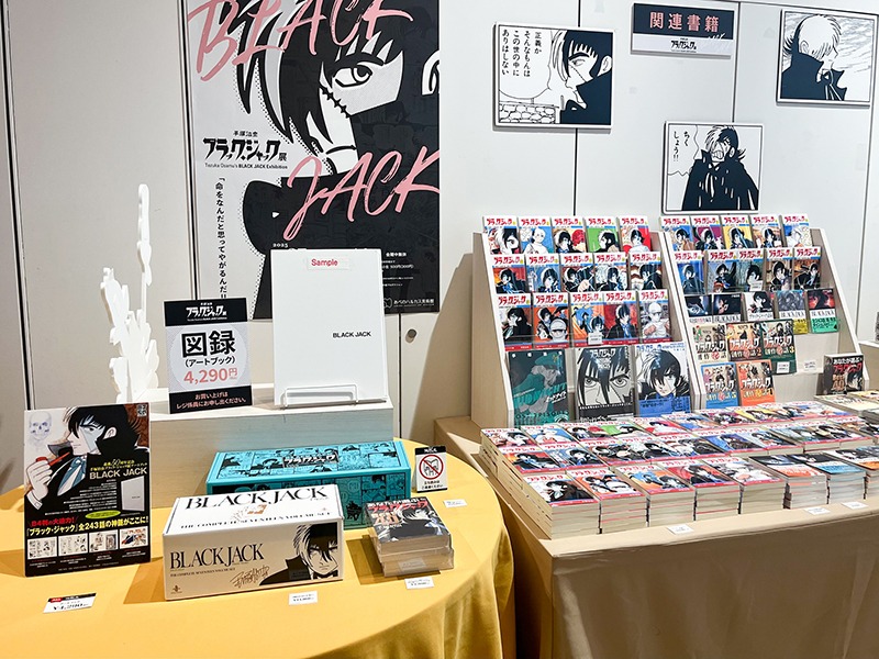「連載50周年記念手塚治虫 ブラック・ジャック展 アートブック」(4,290円)をはじめ、『ブラック・ジャック』全25巻(各600円)や「手塚治虫医療短編集」(880円)などの関連書籍が並びます。