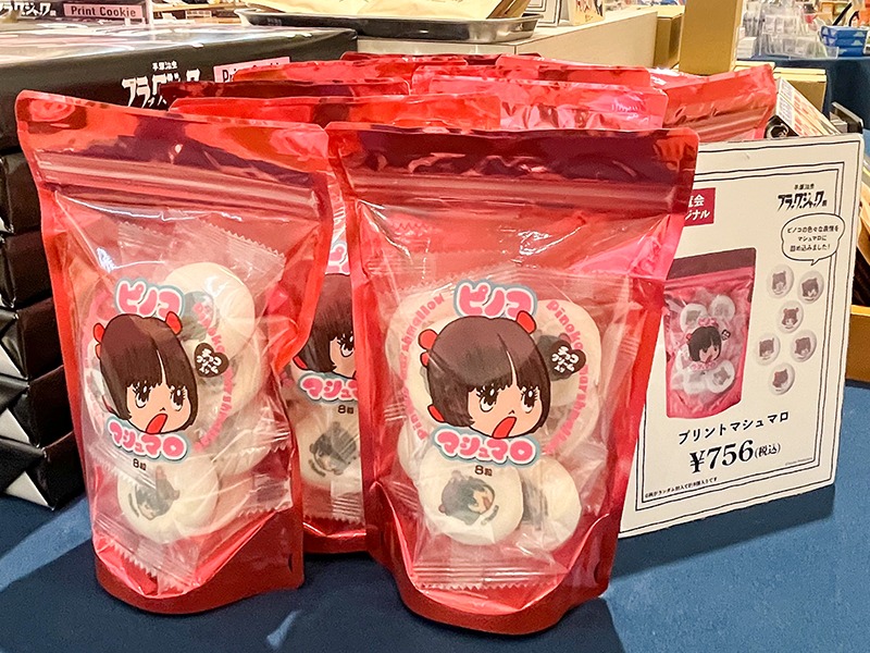 思わず買いたくなってしまう “アッチョンブリケ!”な表情がいい「ピノコアッチョンブリケ スクイーズボール」(1,925円)や「プリントマシュマロ」(756円)などがかわいいグッズがたくさん!