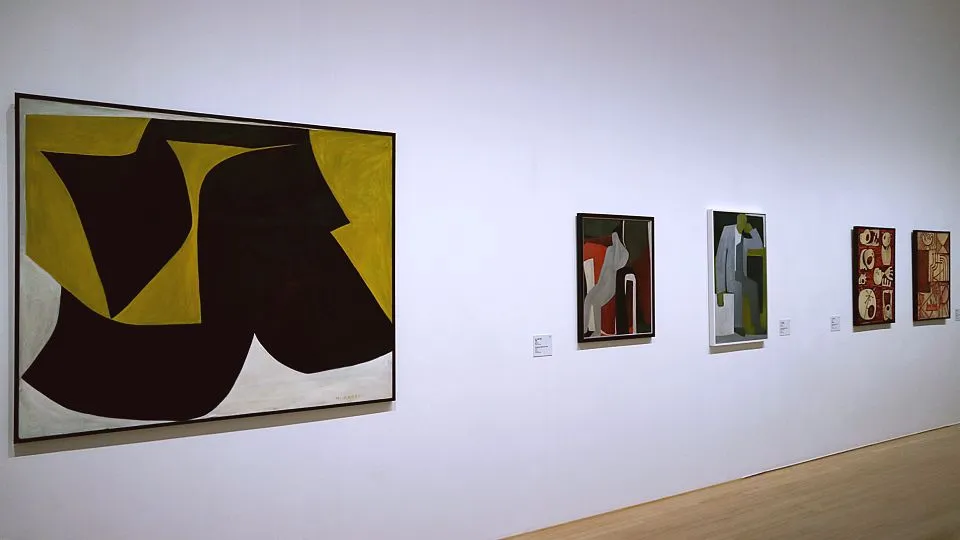 具象的だったフォルムがどんどん変化し、アメリカ留学を経て、限られた色を使った平面的な表現の抽象画に。作風の変遷をたどることができます。