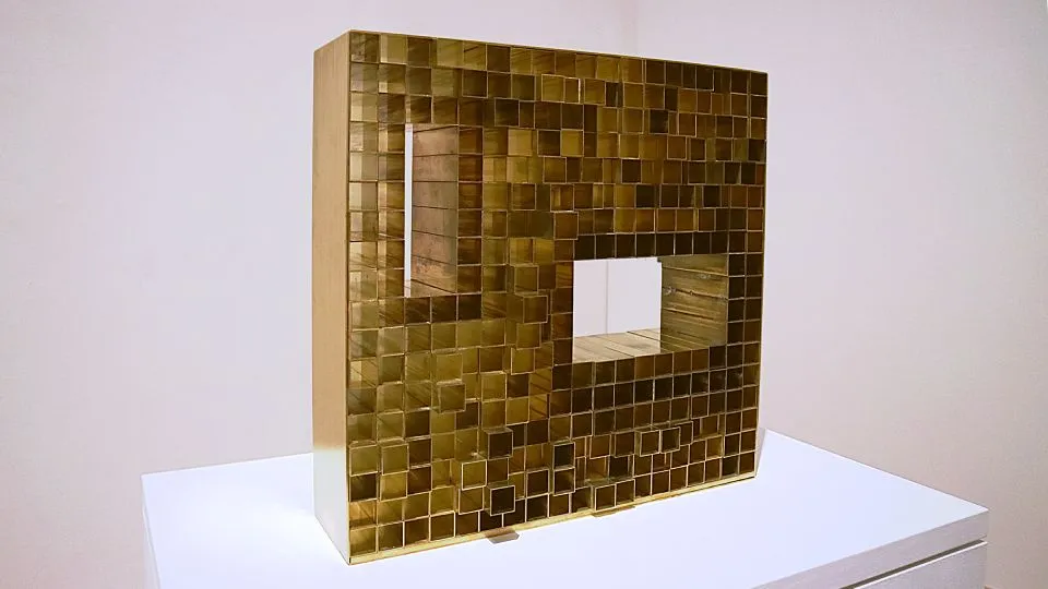 真鍮を使った宮脇愛子の彫刻作品は、光の当たり具合で表情が微妙に変化していきます。