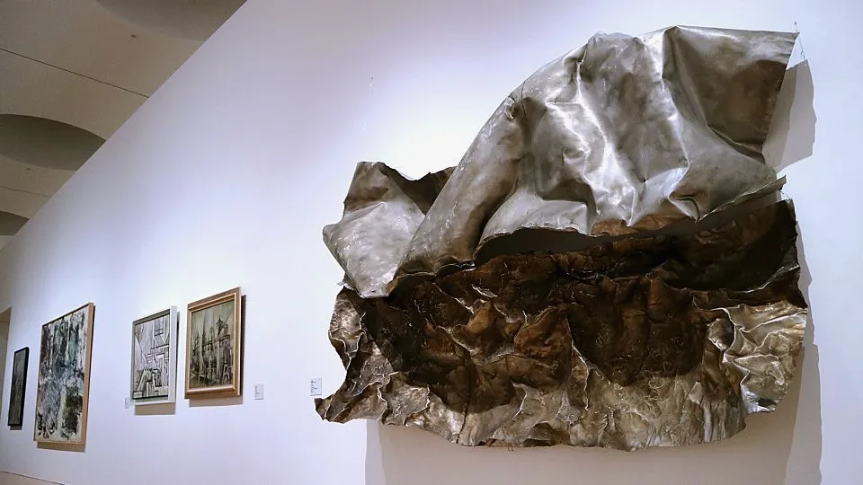 多田美波も空間デザインで知られるひとり。ひときわ目を引くのはアルミをハンマーで叩きあげた大きな造形物です。