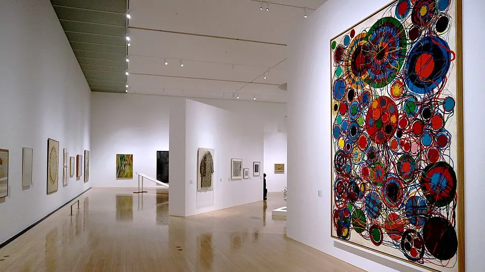 反復的に続く網目を大画面に描き、世界的評価を得た草間彌生。自分を網目の中に埋没させていく持続的な作業も、アクション・ペインティングとは対照的な「アンチ・アクション」です。