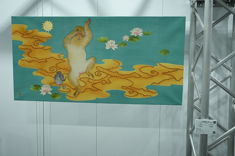 こちらは、京友禅染職人の永澤翔子と日本画家の板垣夏樹による京都らしい作品の「猿亀酔戯画」。