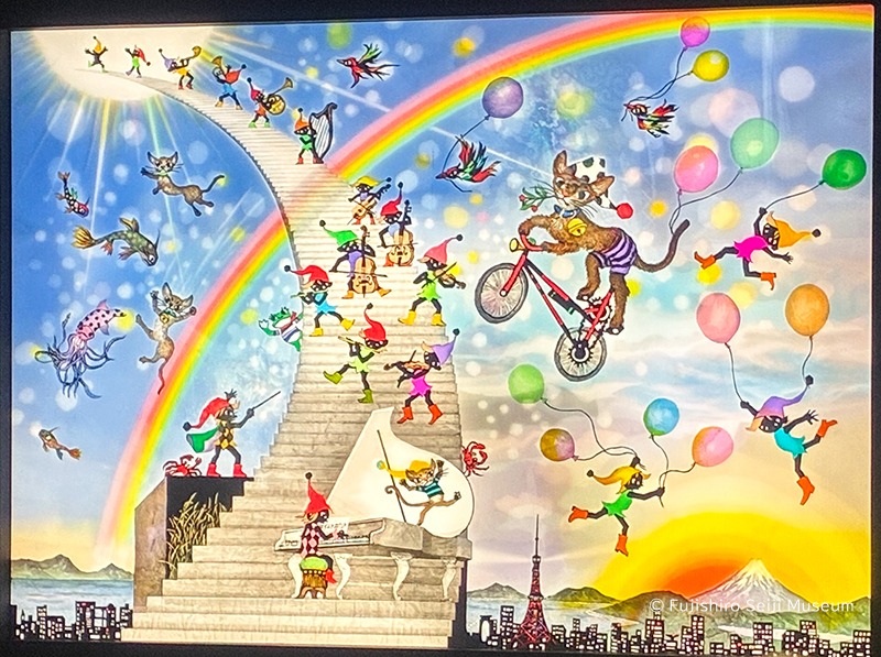 藤城先生によると、この作品には、「楽しい喜ばしい天国が、世の中に広がっていけばいいな」という祈りが、絵の中に込められているそうです。
