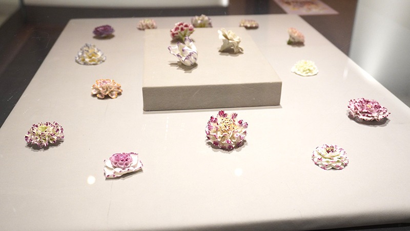 展示では花の部分のみが並べられていますが、元々は生花を生けるように飾られていたのだそうです。