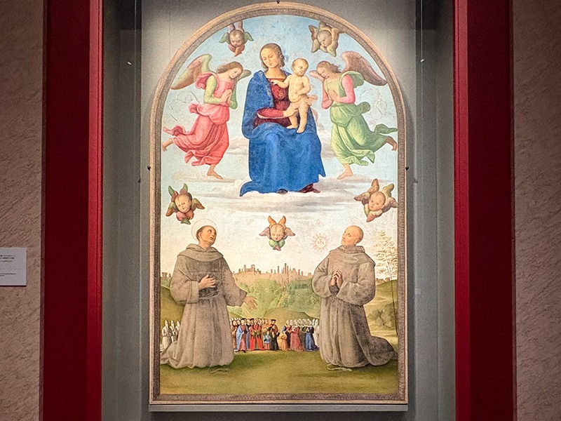 ピエトロ・ヴァンヌッチ(通称ペルジーノ)(1450〜1523)《正義の旗−聖フランチェスコ、シエナの聖ベルナルディーノ、祈る正義兄弟会の会員たちのいる聖母子と天使》 ウンブリア国立美術館 © Galleria Nazionale dell‘Umbria