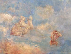 ルドンは神話の物語性より色彩に重きを置いていたようで、馬車が駆ける空の水色が美しい作品。