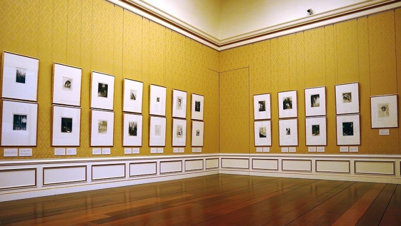 最初の展示室、黄色い壁が印象的な「黄の間」には、モノトーンの版画作品がずらりと並びます。とても重苦しい雰囲気が漂うのは、黒一色なせいだけではありません。