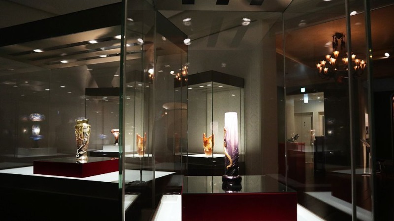 ガレやドームのガラス工芸コレクションも充実。展示ケースはヨーロッパのメーカーに特注したものだそう。世界の逸品がずらり照明に浮かび上がる幽玄な空間は一見の価値あり。