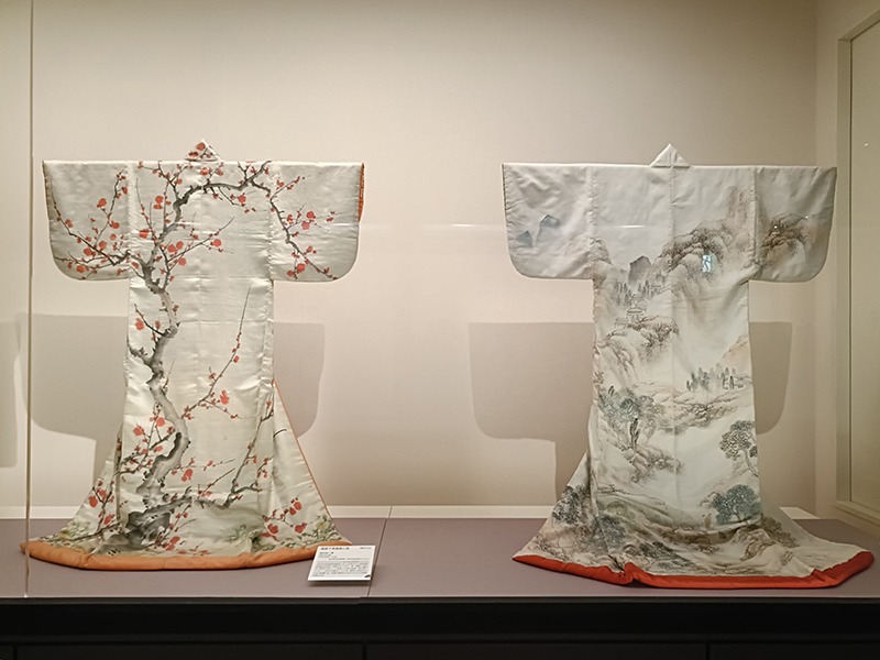 【重要文化財】酒井抱一筆《梅樹下草模様小袖》19世紀、呉春筆《楼閣山水模様小袖》18世紀 いずれも国立歴史民俗博物館蔵 野村正治郎衣裳コレクション