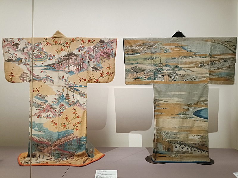(左から)《京名所模様小袖》18世紀、《江戸名所模様下着》款記「縫木」19世紀 いずれも国立歴史民俗博物館蔵 野村正治郎衣裳コレクション