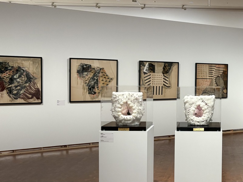 写真後方・田部光子「プラカード」1961 左から1点目と3点目は東京都現代美術館蔵、2点と4点目は福岡市美術館蔵