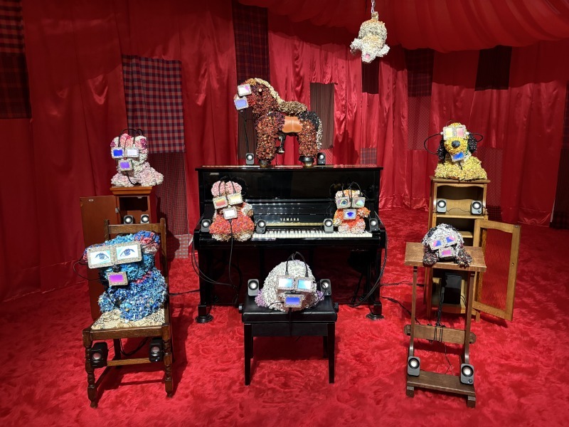 笹岡本人の顔のパーツを持った熊やうさぎ、猫など9体の動物が歌う合唱は、不気味みでありながら愛らしさも感じます。