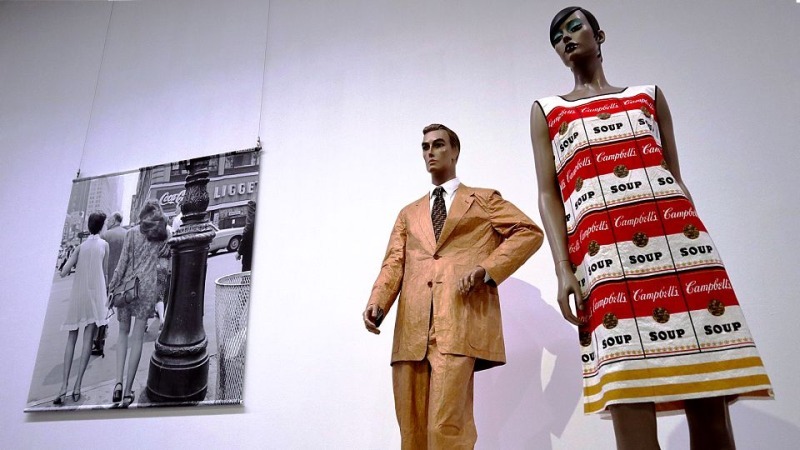 右側のワンピース、これもキャンベルスープ缶のモチーフ!ウォーホル人気でスープ製造会社のキャンベルがつくったものだそうです。