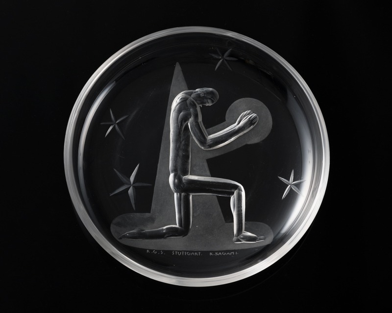 各務はガラス工芸の腕を磨くためにドイツに留学し技を磨いた作家で、直線や幾何学模様を用いたデザインに欧州のエッセンスを取り入れています。第一次世界大戦後のドイツの人びとが、平和への祈りを向けていた姿を作品に刻みました。