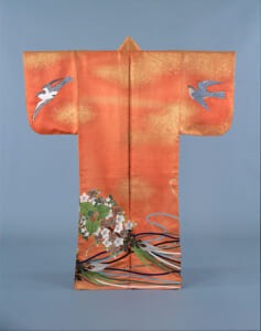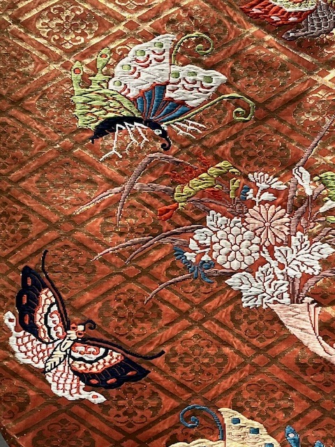 紅地二重菱繋蝶花熨斗模様唐織