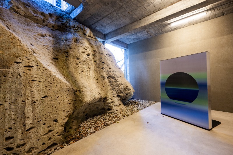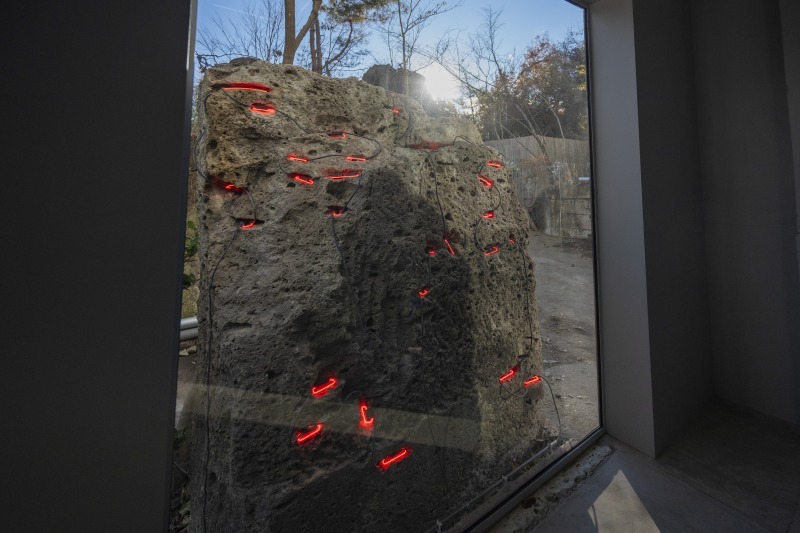 階段を下ると、ガラス越しの屋外に、巨大な岩と赤いネオン管が組み合わされた作品が現れます。