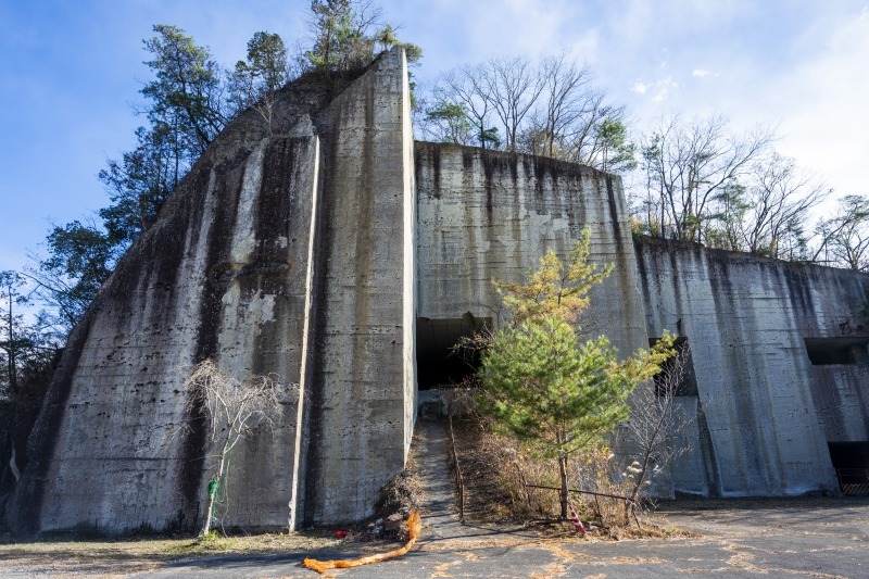 YOSHIROTTENがインスピレーションを得た稲荷山にそびえ立つ石切場の石壁は大迫力です。(※安全のため石窟内部への立ち入りはできません)
