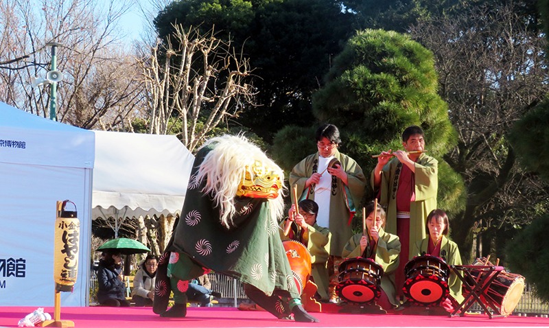 おめでたい太神楽や獅子舞、小金井市指定無形民俗文化財の「関野町餅つき」や「小金井囃子」など、新年にふさわしい催しを、特設ステージで上演します。