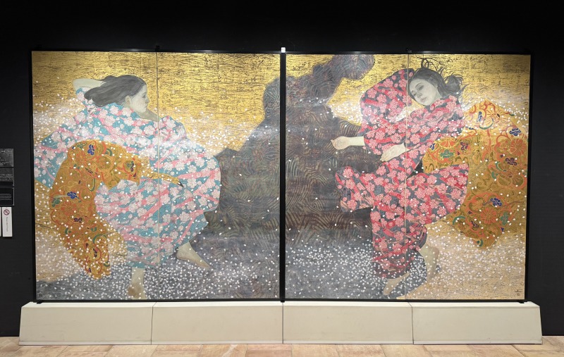 尾形光琳の『紅白梅図』からヒントを得た本作は、右に夜の桜、左に昼の桜が描かれています。