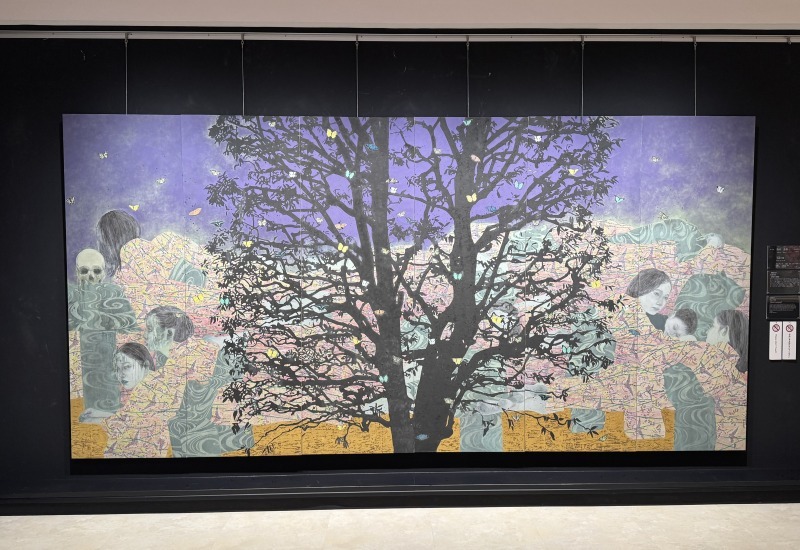 画面右側に「生」、左側に「死」を描いた本作。そして大きな樹の周りには、「再生」を意味する色とりどりの蝶が舞っています。