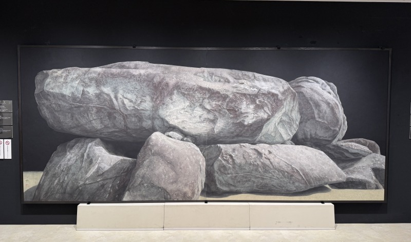 真っ黒の画面に浮かぶような重厚感ある石からは、奥行きが感じられます。見ているだけで心静かに、落ち着くことができるような絵です。