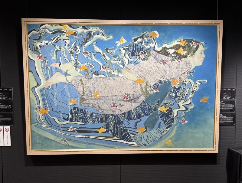 海を泳ぐ人物と、その周りに配置された金魚や水紋が特徴的な本作。