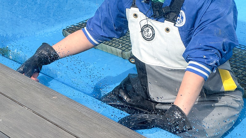 水を全て抜いた後、スタッフが水槽の溝をヘラでキレイに掃除しています。