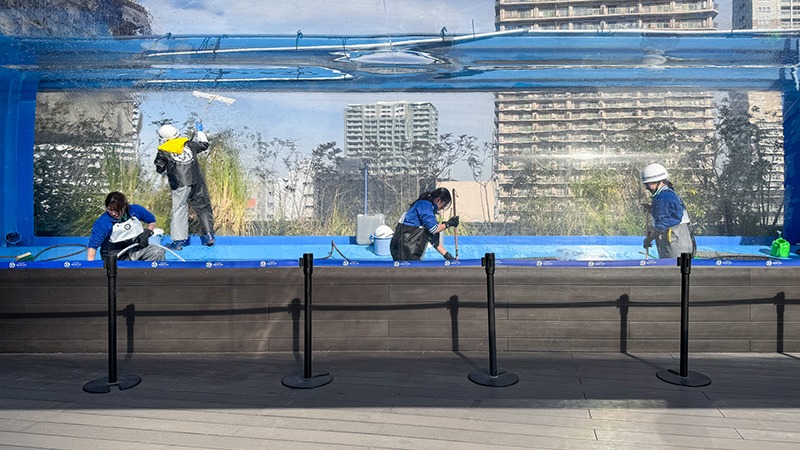 ふだん見ることのできない水族館の大掃除のようすも、今回特別に見せてもらいました。