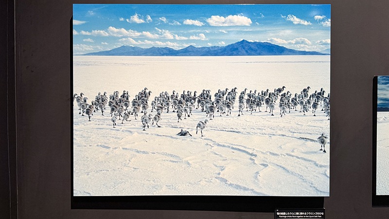 一斉に走り出すフラミンゴのひなを捉えた作品も展示。