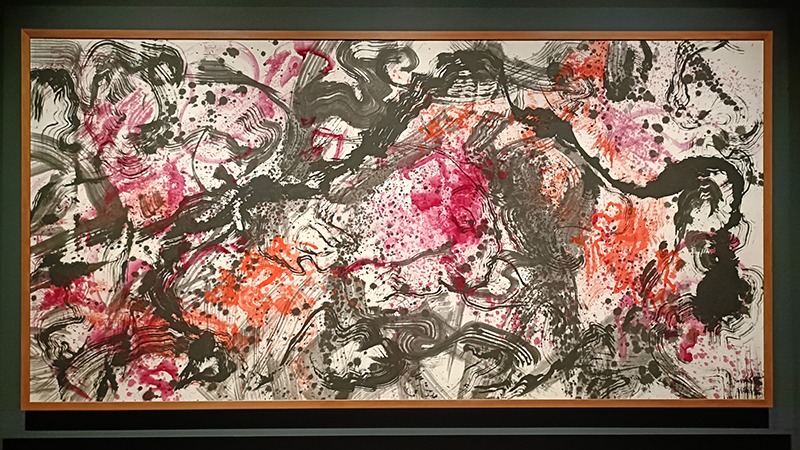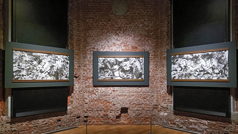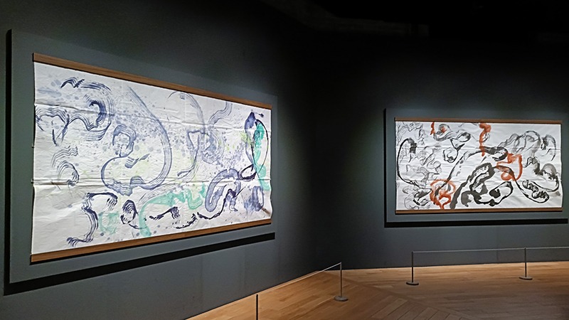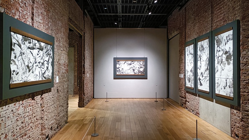飛び散る墨やうねるような線の重なりは、書道のようでもあり、激しいアクション・ペインティングのようにも見えます。