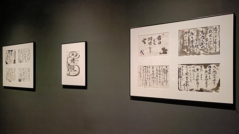 紙のシワや折り目、墨の生々しい質感を間近で感じられ、制作時の力強い躍動感がダイレクトに伝わってきます。
