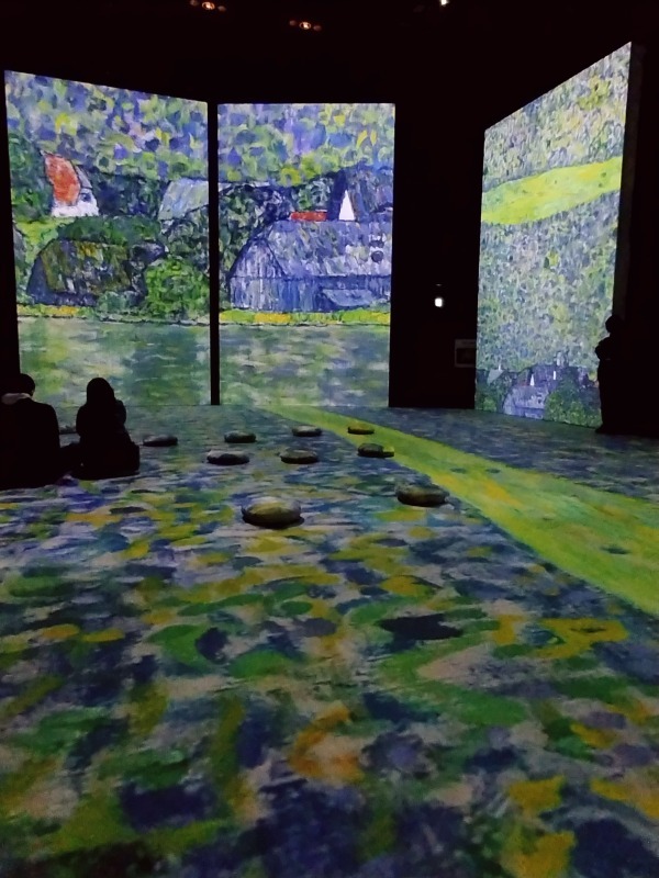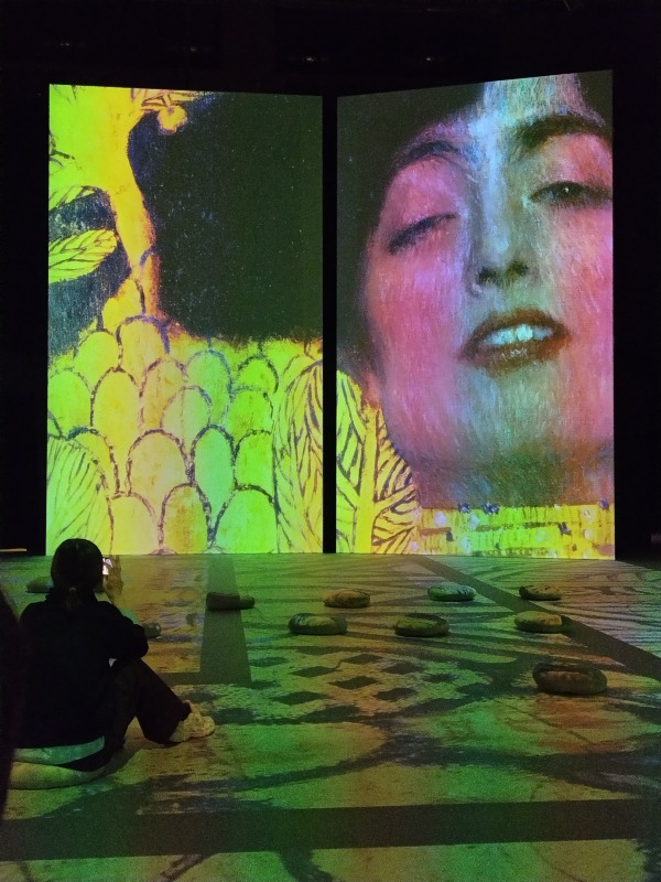 壁から床まであらゆる境界が映像に飲み込まれ、クリムトの世界に全方位から包まれます。重厚な音楽と香りの演出も相まって、視覚だけでなく五感でその世界観を浴びるような体験でした。