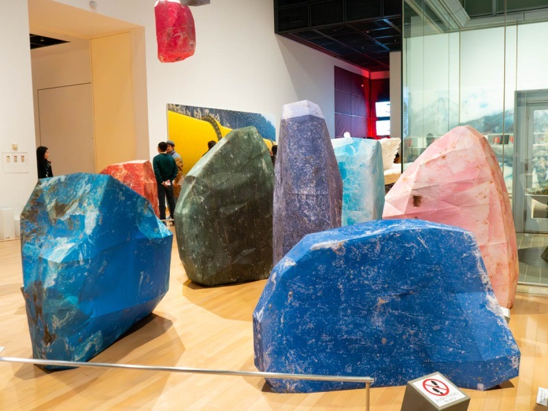 会場の中央でひときわ目を引くポップな物体は、海岸で採集したマイクロプラスチックを3Dスキャンし、超マクロ撮影した写真をマッピングし、巨大なペーパークラフトとして再構成した作品です。
