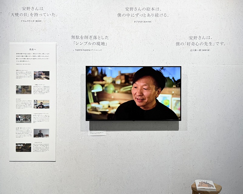 展示の冒頭では、安野から影響を受けた現代のクリエイター6名による映像メッセージ「先生へ」を上映しています。