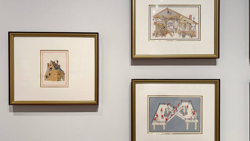 展示室に入ると、まず紹介されているのは安野の初期の三部作『ふしぎなえ』『さかさま』『ふしぎな さーかす』の貴重な原画が展示されています。