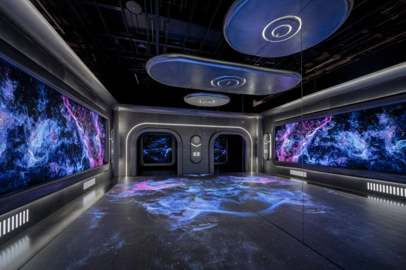 続く展示室では、「Floating Through Space」という宇宙船を想起させる映像インスタレーション。SF映画のような空間が広がります。