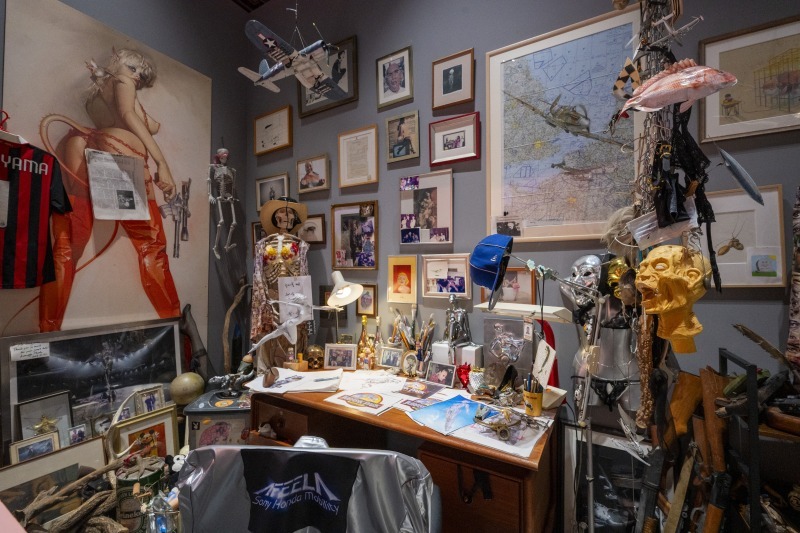 なお、この展示室の中央には、空山基のアトリエの再現も。壁に貼られたポスターや机に並ぶたくさんの小物からは、独創的な作品を生み出すアイデアの源も見えてくるようです。