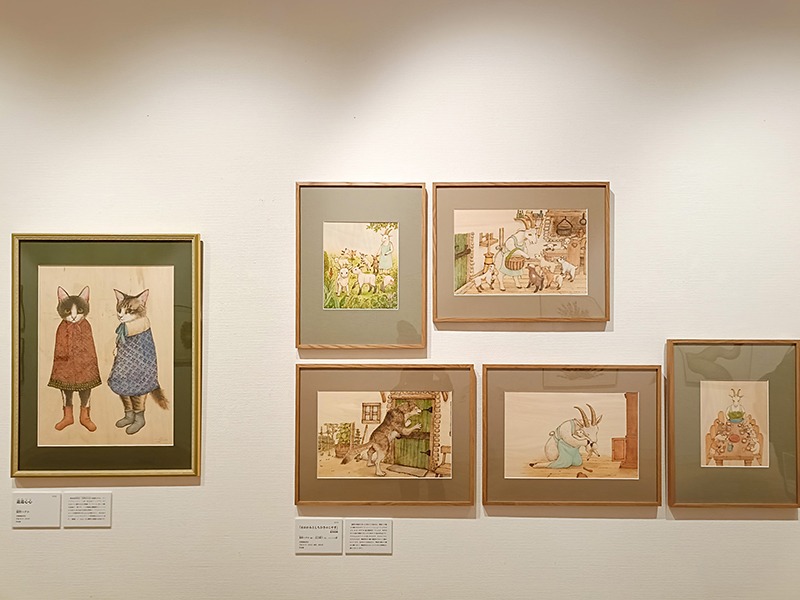 (左から)《遊遊心心》 猫野ぺすか、《『おおかみとしちひきのこやぎ』絵本原画》 猫野ぺすか(絵)・末吉暁子(文) いずれも平成30年(2018) 作家蔵