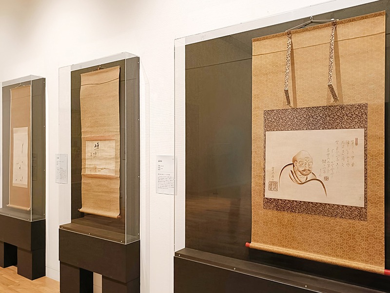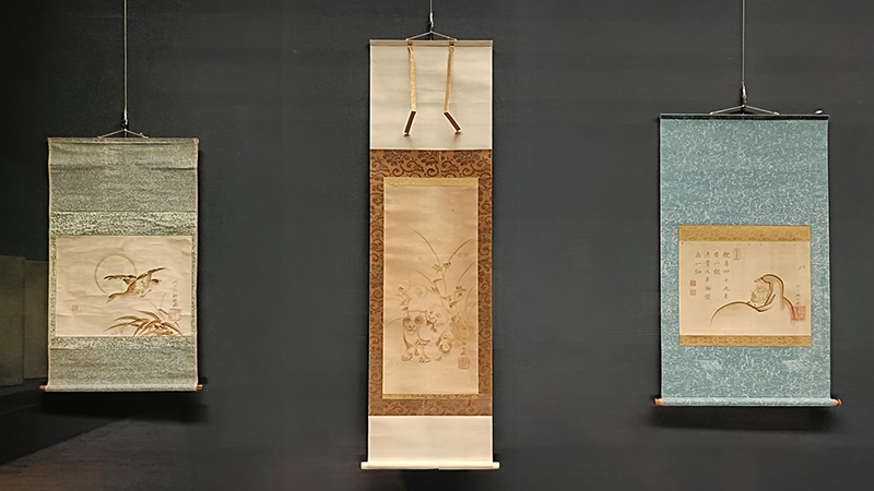 (左から)《月芦雁図》 白峨 江戸時代(19世紀) 個人蔵、《露草狗子図》 白峨 江戸時代(19世紀) 彌記繪菴、《面壁九年達磨図》 白峨 江戸時代(19世紀) 彌記繪菴