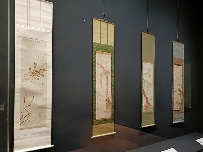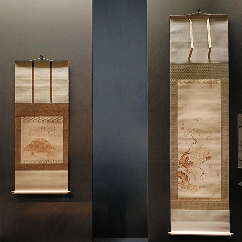 (左から)《亀図》 如秀、洞山人賛 江戸時代(18~19世紀)、《梅鶴図》 蘭旭 安政3年(1856) いずれも彌記繪菴
