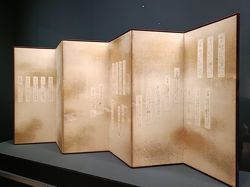 また、『雨月物語』で知られる読本作家・上田秋成が和歌を記した短冊を貼り交ぜた屏風には、焼絵で花や虫が描かれています。