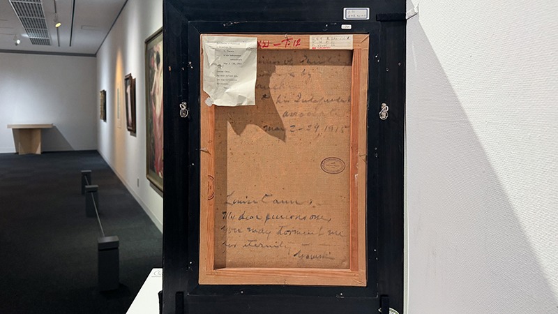 通常の壁面への展示ではなく、本作は裏表が見えるように紹介されています。絵画の裏面を見る機会は、なかなかないので会場でじっくりとご覧ください。