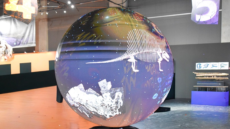エリアを移動するたびに目を引くのが、会場中央に鎮座する球体スクリーン「大絶滅スフィア」。地球の生態系が長い歴史の中でどのように移り変わったのか、迫力満点の映像で紹介されています。